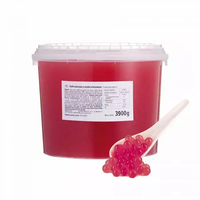Wygląd: kulki o średnicy około 7-9 mm w intensywnym kolorze arbuzowym, które nadają napojom letnią, orzeźwiającą atrakcyjność wizualną.